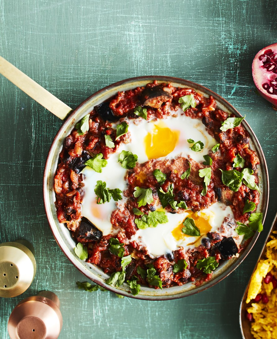Shakshuka on aamiaishitti! Ruokaisampi versio syntyy, kun mukaan sujautetaan munakoisoa ja mustapapuja.