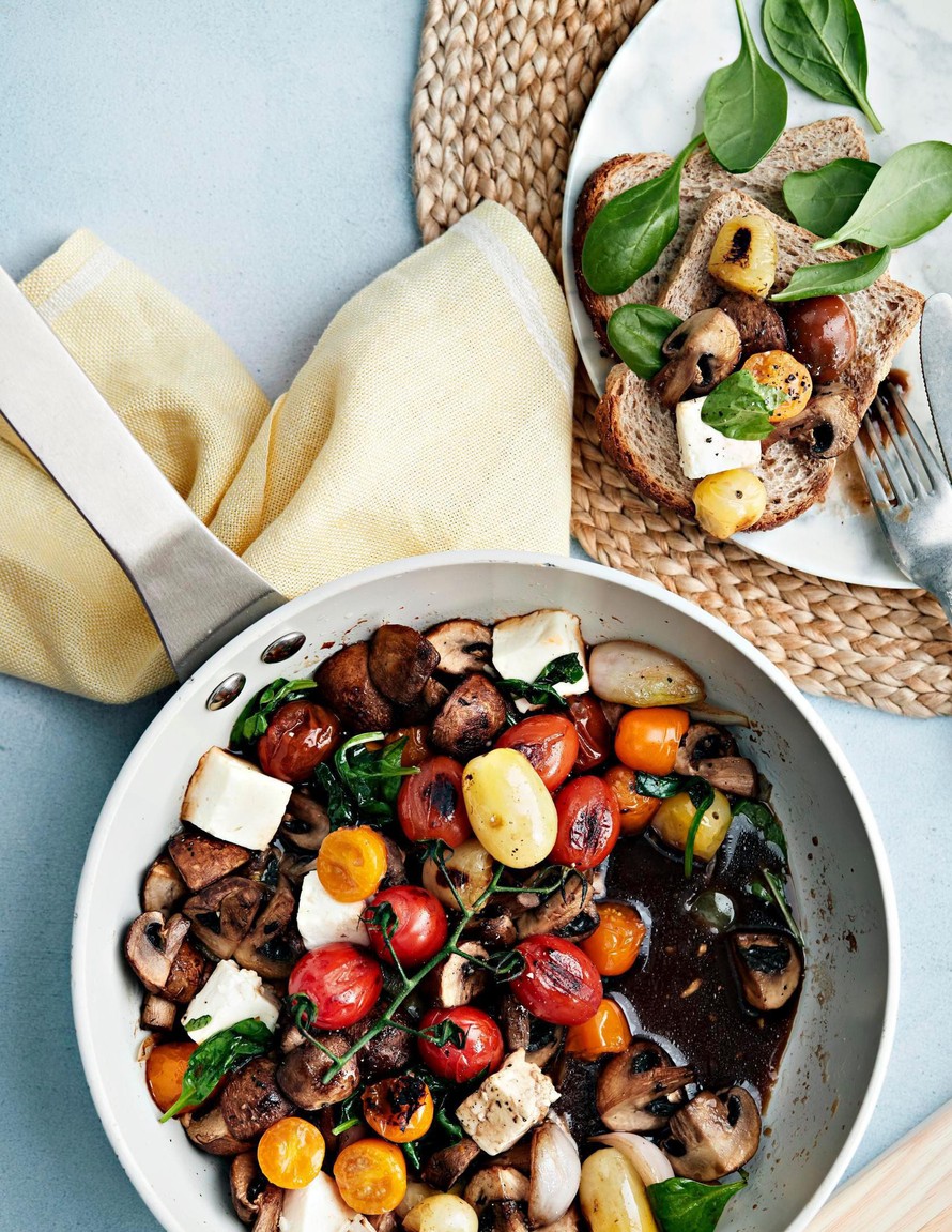 - Kuumenna öljy pannulla. Paista kuumalla pannulla sipulia ja sieniä noin 5 minuuttia. Lisää tomaatit, feta ja balsamicokastike. Jatka kypsennystä 10 minuuttia.