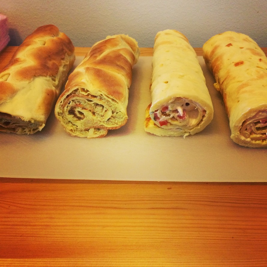 Vaikka halusin päästä ruokaruljanssista helpolla, en tietenkään päässyt lusmuamaan. Juhlatoimikunta päätti hoitaa brunssitarjoilun vegepainotteisesti, joten päätin valmistaa vieraille muutaman munakasrullan.