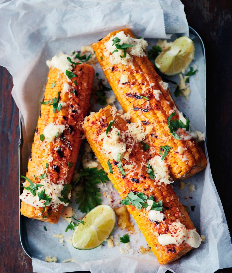 Grillaa maisseja vartti, sivele ne chiliöljyllä ja viimeistele limetillä, korianterilla, majoneesilla ja cheddarilla.