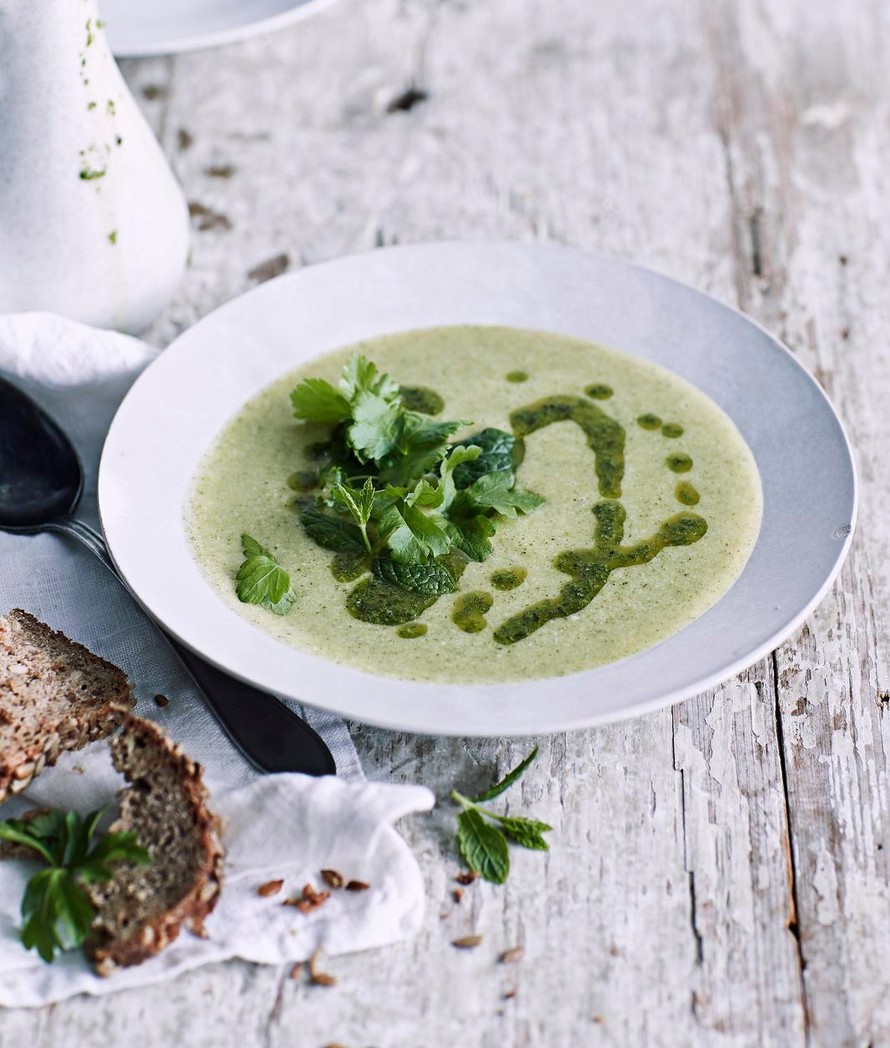 - Valmista yrttiöljy. Mittaa ainekset kulhoon ja soseuta sauvasekoittimella sileäksi. Valuta yrttiöljyä keittoannoksen päälle. Tarjoile lisäksi täysjyväleipää.