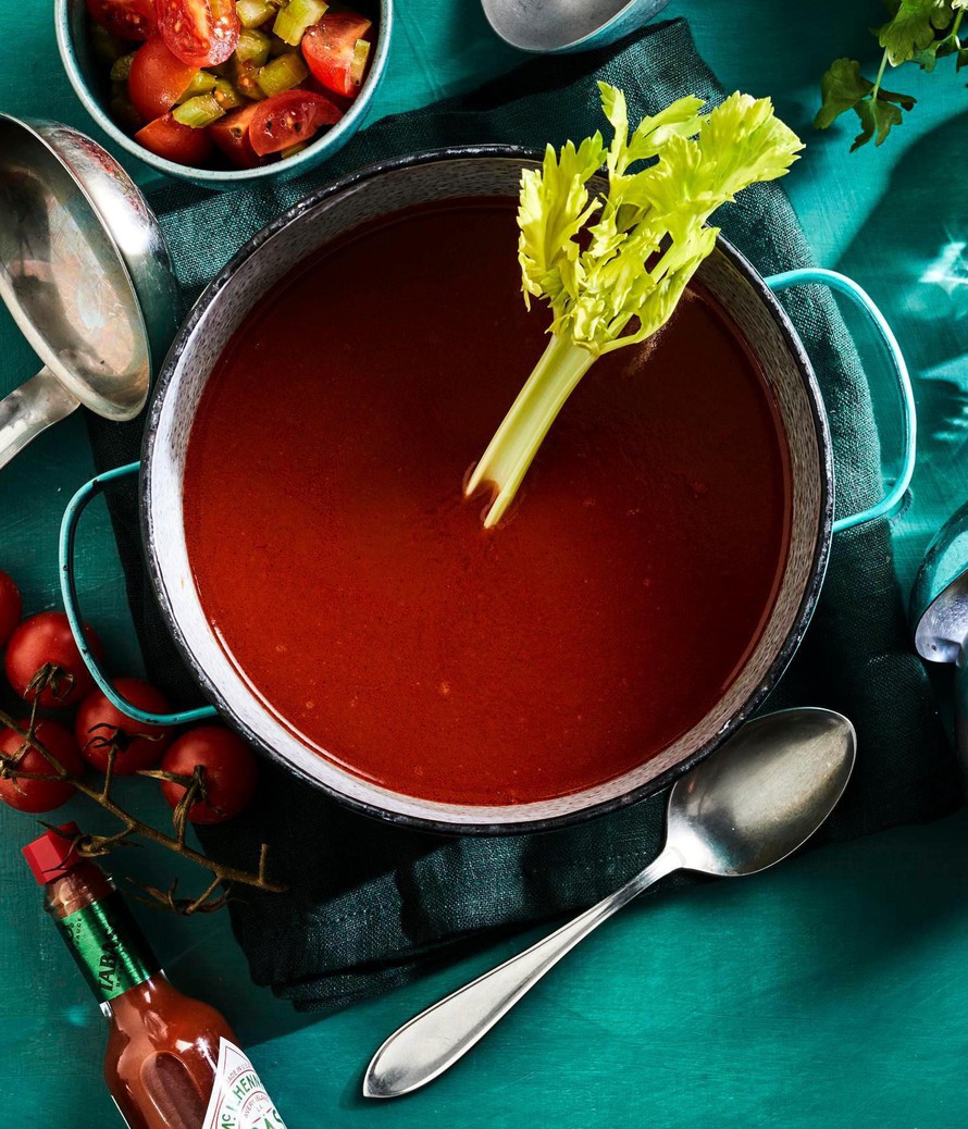 Intensiivisen tomaattinen liemi, lisukkeena tabascoa, selleriä ja snapsi. Tämän alkupalakeiton inspiraationa toimii klassinen Bloody Mary -drinkki. Oivaltavan hauska keitto sopii erinomaisesti viikonloppuillallisen alkuruoaksi.