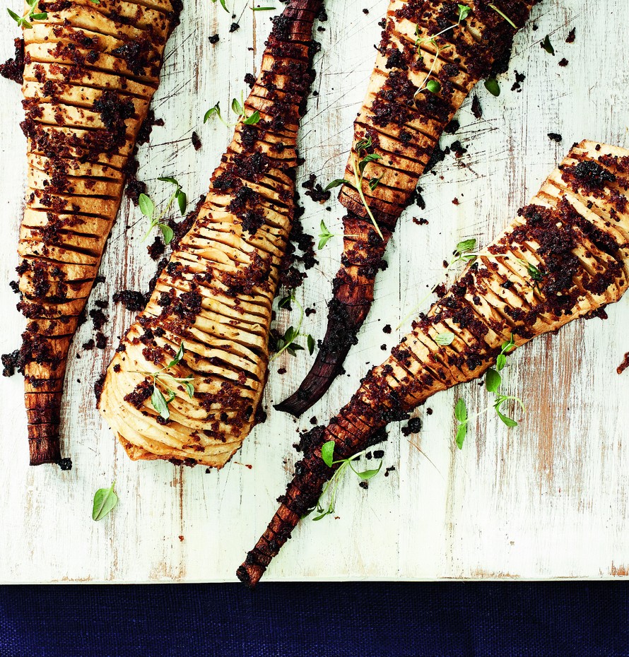 - Laske uunin lämpötila 175 asteeseen. Sekoita kulhossa hunaja, öljy ja mausteet. Raasta leipäviipale. Sivele esikypsennetyt palsternakat hunaja-öljyseoksella ja ripottele leipämurut pinnalle. Jatka kypsennystä toiset 30 minuuttia tai kunnes palsternakat ovat pehmeitä. Viimeistele tuoreella timjamilla.