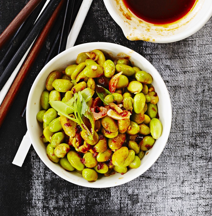 - Kuumenna öljy pannulla. Laita valkosipuliviipaleet öljyyn ja paista 1 minuutti. Kaada pannulle maustekastike ja anna kiehua hiljalleen kuplien 5 minuuttia. Lisää joukkoon soijapavut ja anna maustua 2 minuuttia.