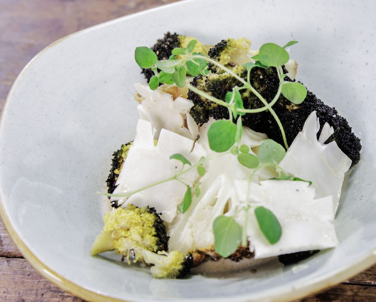 - Leikkaa raa’asta kukkakaalin jalasta juustohöylällä tai mandoliinilla ohuenohuita viipaleita. Leikkaa paahdettu kukkakaali ja parsakaali reiluksi lohkoiksi. Asettele ne ja kukkakaalin jalasta leikatut viipaleet lautasille. Tarjoa kermaisen kastikkeen kanssa ja viimeistele halutessasi tuoreella oreganolla tai krassilla.