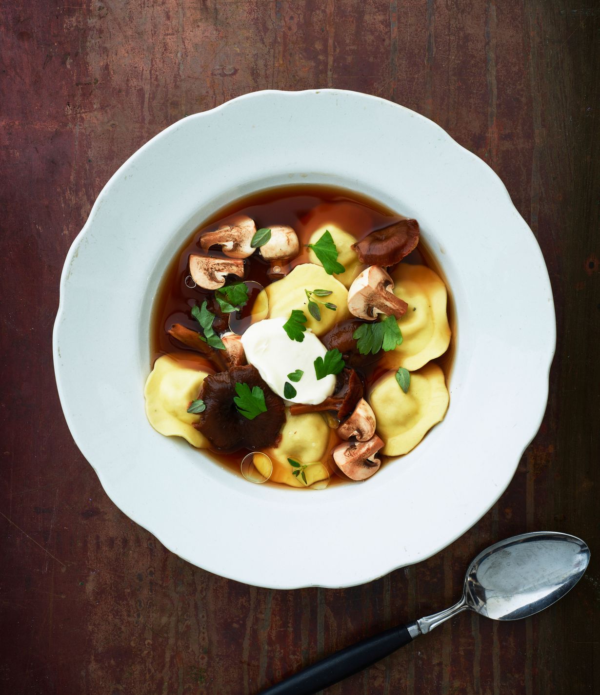 - Keitä raviolit suolalla maustetussa vedessä pakkauksen ohjeen mukaan. Tarjoa raviolit kuuman sieniliemen, crème fraîchen, tuoreiden herkkusienien ja yrttien kera. Viimeistele pippurilla ja oliiviöljyllä.
