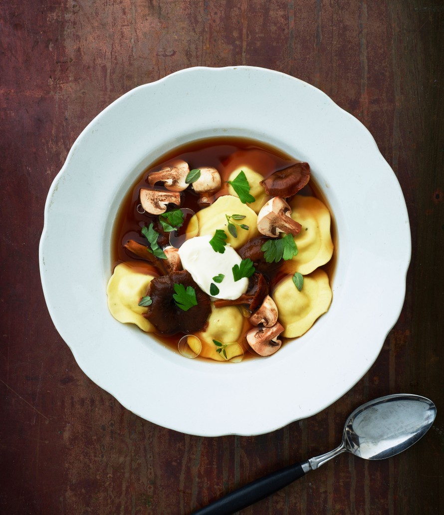 Herkullisen sieniliemen keittäminen vie aikaa mutta vain vähän vaivaa. Raviolit saavat umamisesta kasvisliemestä mainion kylvyn.