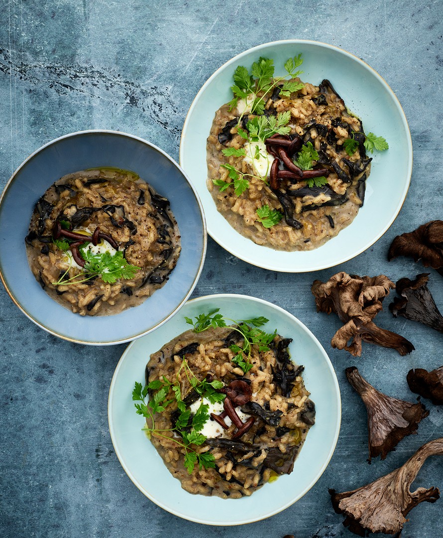 Paras sienirisotto tehdään itse keiteltyyn sieniliemeen. Mustatorvisienten hienous saa kiehtovan kaverin sikurirouskusta, jota ripautetaan risottoon lisämausteeksi.