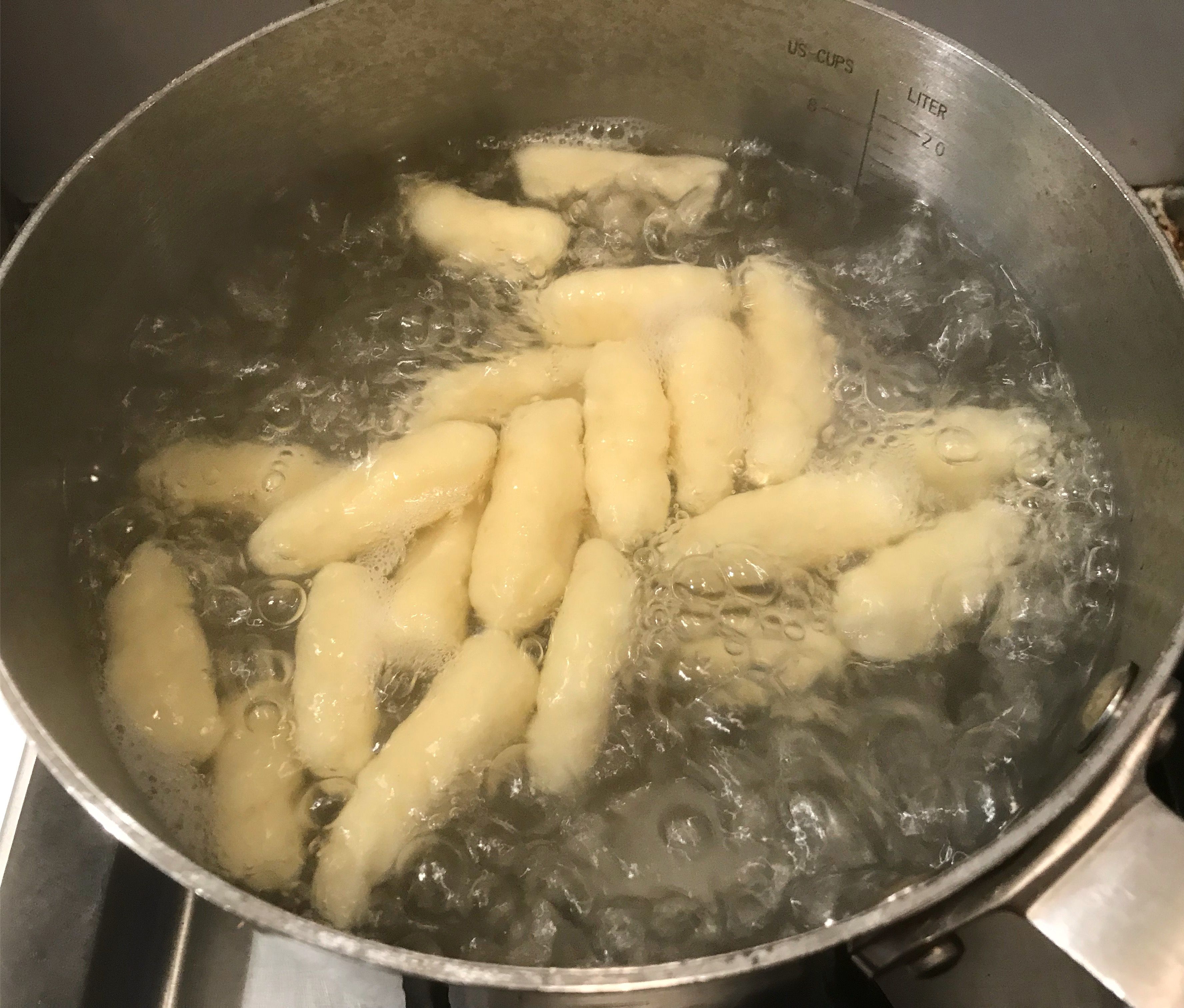 Taikina kiinteytyy yllättävän nopeasti. Älä siis vaivaa liikaa, vaan juuri sen verran, että saat kiinteän, muovailtavan taikinapötkön, jolloin gnocchit eivät hajoa keitettäessä.