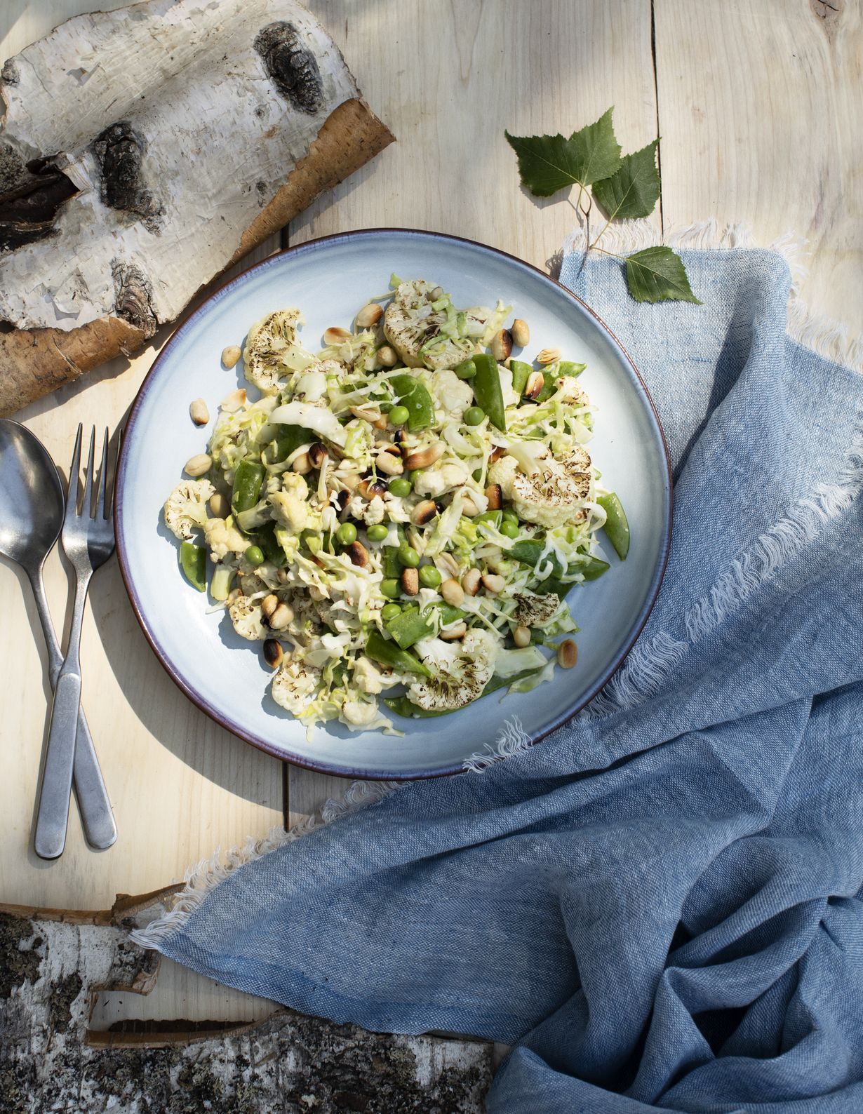 Kevyesti paahdetussa kukkakaalisalaatissa rouskuvat keskikesän tuoreet kasvikset.