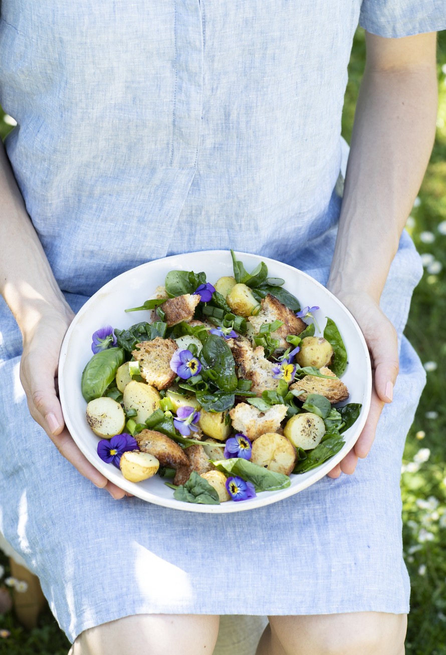 - Pese ja revi pinaatti ja basilika. Silppua sipulinvarret. Sekoita ne perunoiden ja leipien joukkoon. Koristele salaatti orvokeilla.