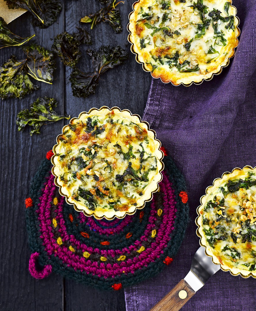 Spelttijauhoista leivotuissa pikku piirakoissa lehtikaali kohtaa täyteläisen juuston ja rapsakan pähkinärouheen.