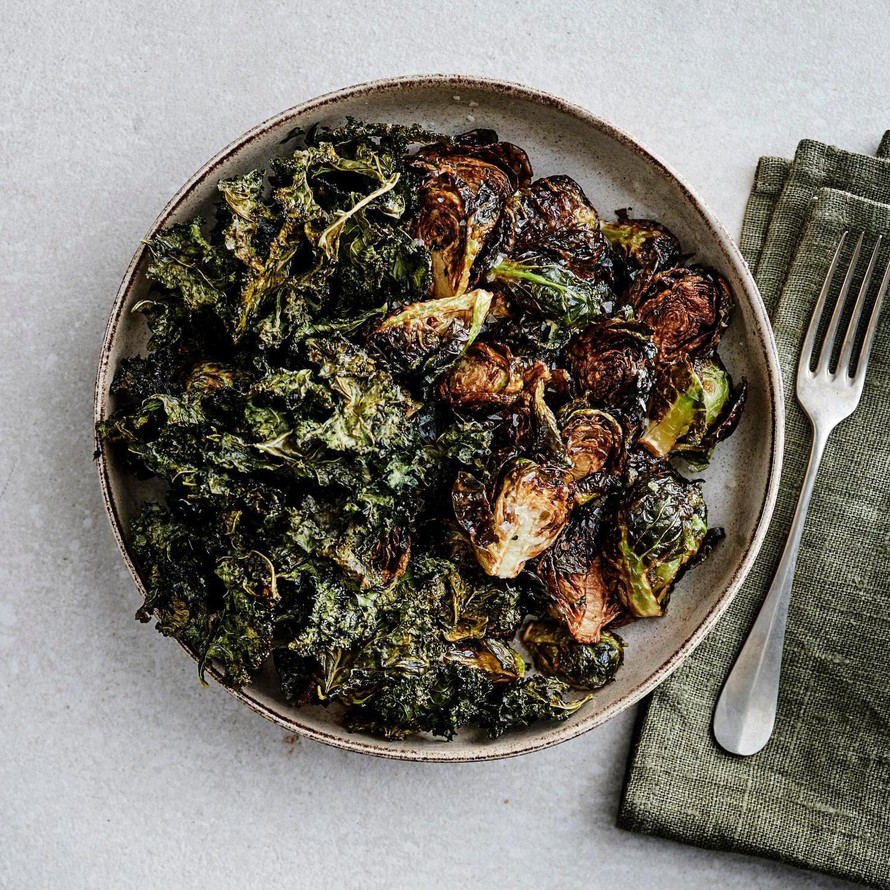 Kuumenna uuni 150-asteiseksi. Poista lehtikaaleista lehtiruodit ja revi lehdet isoiksi suupaloiksi. Huuhtele ja kuivaa lehdet hyvin, pyörittele öljyssä ja mausta suolalla. Paahda uunissa 8 minuuttia, laske uunin lämpö 100 asteeseen ja paahda rapeiksi, 10–15 minuuttia. Valmista sillä aikaa ruusukaalit.