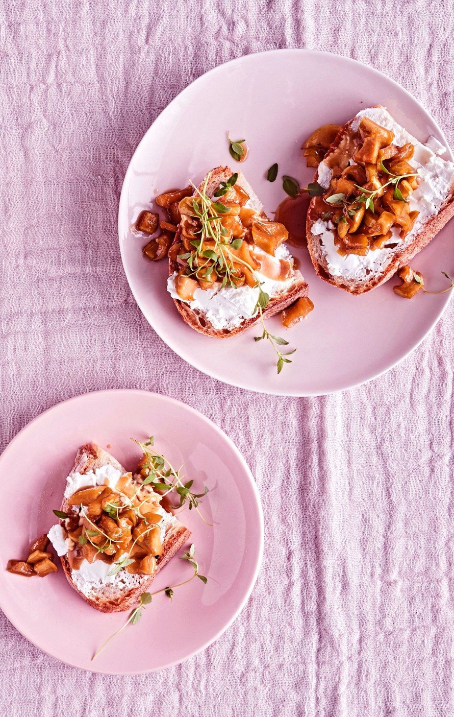 - Paahda leipäsiivut paahtimessa. Levitä vuohenjuustoa reilusti siivuille. Nosta omenakinuskia leivälle ja koristele timjamin oksilla.