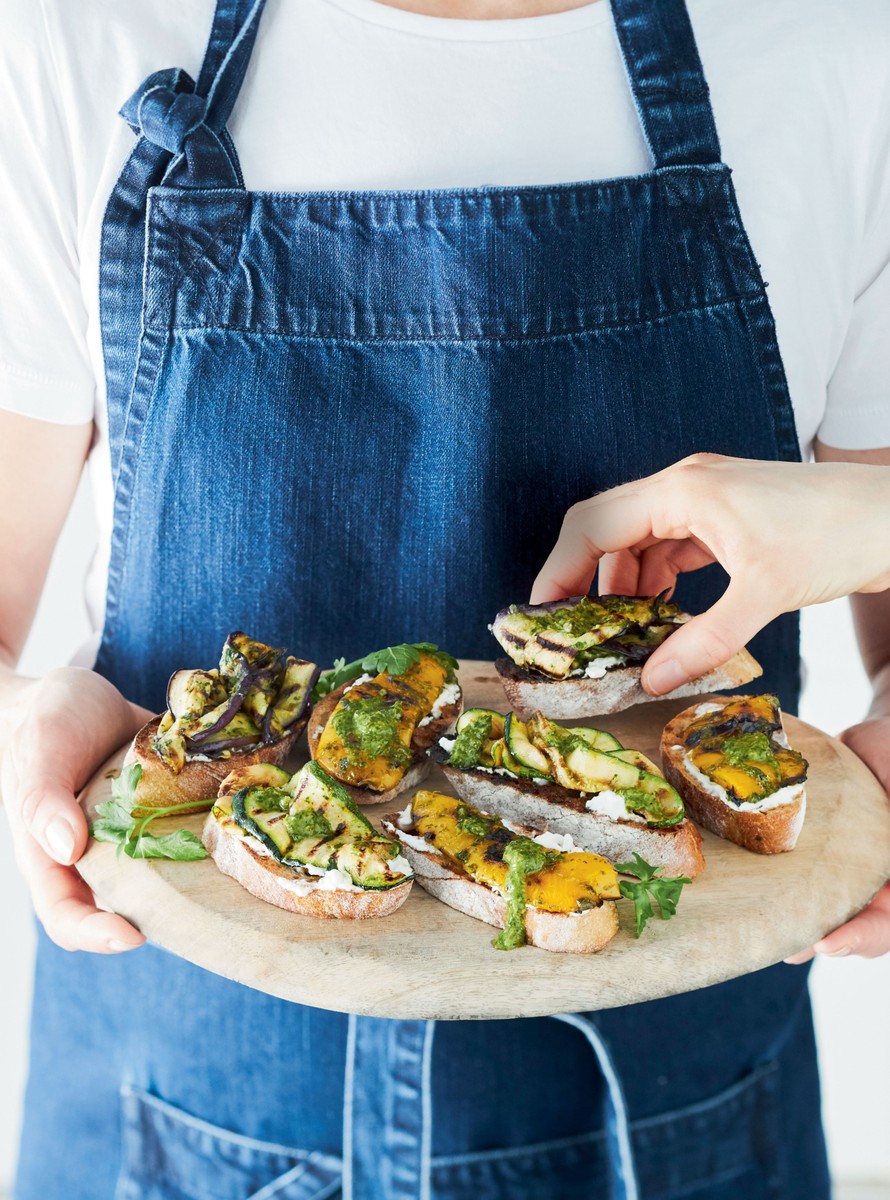 Maukkaat bruschetat sopivat tarjottavaksi aperetiivin kanssa. Pikainen grillaus pehmentää kasvisten rakennetta ja antaa niille makeutta.