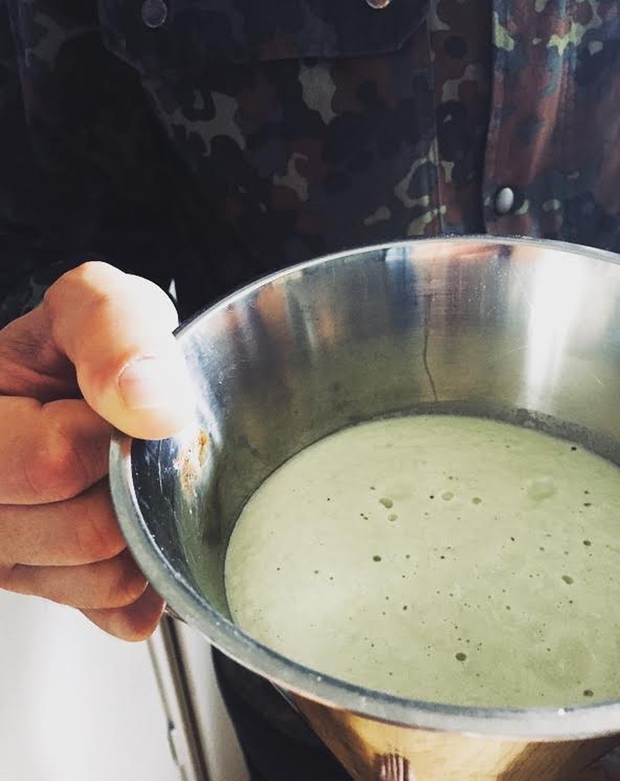 Kukkakaalissa ON proteiinia ja hiilihydraatteja! Koostumus näyttää Finelin taulukoissa hyvältä, mutta ministerin mainitsemaa kukkakaalipirtelöä ei harmi kyllä moni siviilikasvissyöjäkään ole ryystänyt. Me täällä Tajuttomassa Keittokirjassa olemme kuitenkin ennakkoluulottomia ja kokeilunhaluisia! Onneksi kotonamme asuu alan asiantuntija, joka on juuri sopivasti lähdössä marssimaan. Asiantuntija on käynyt läpi useita satoja sotaharjoituksia niin alokkaana, kokelaana kuin harjoitusten johtajanakin sekä syönyt Puolustusvoimien ruokaa yli 20 vuotta.