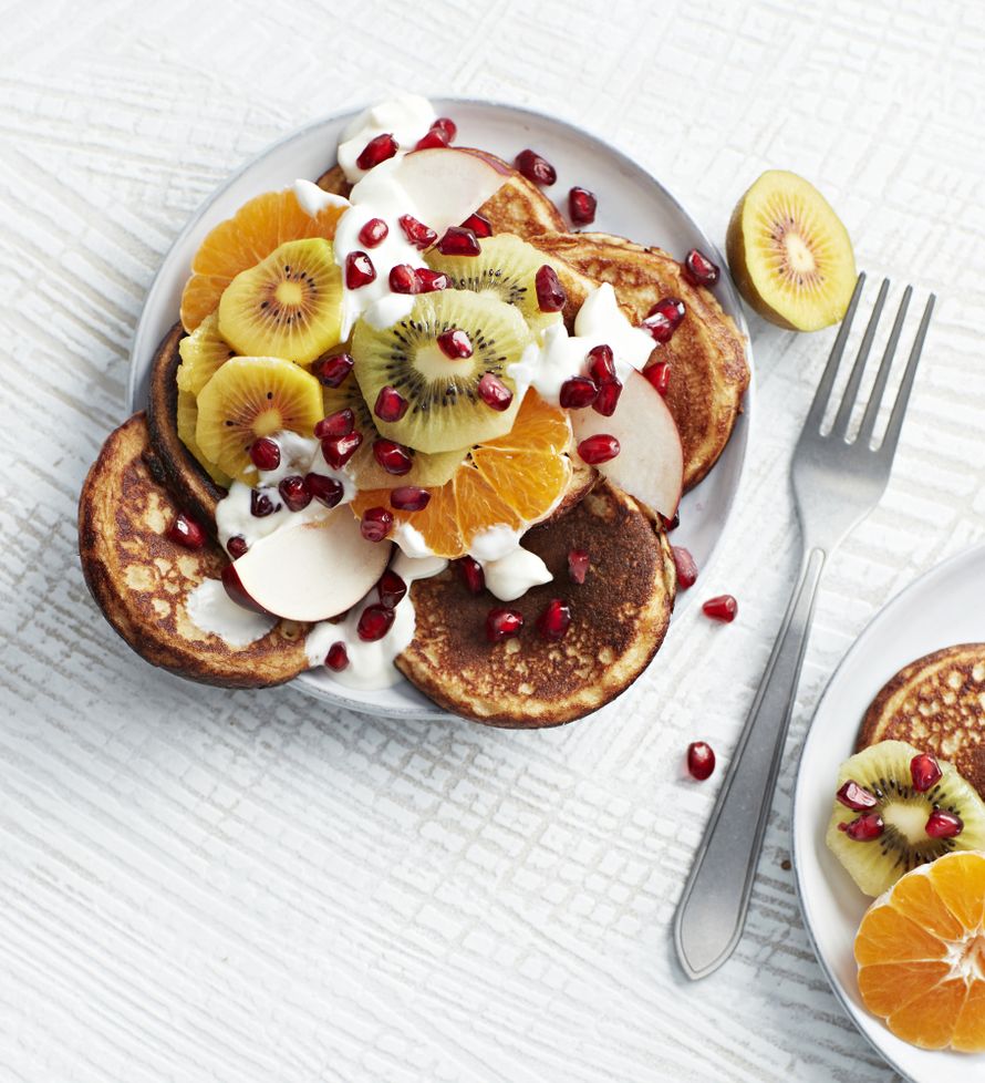 Paista öljyssä lettupannun koloissa molemmin puolin kullanruskeiksi. Tarjoa hedelmien ja kreikkalaisen jogurtin sekä juoksevan hunajan kanssa.
