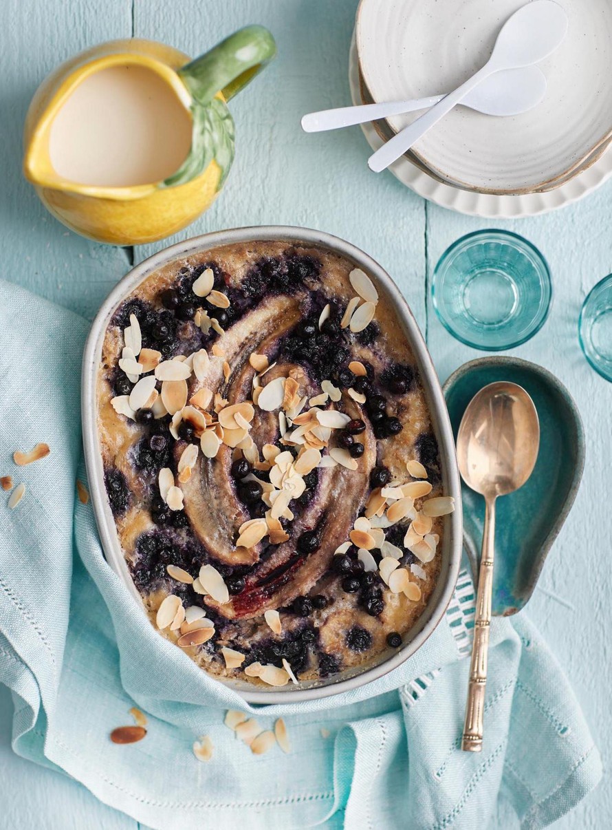 Maukas mustikka-banaanipuuro hautuu uunissa ihanan pehmeäksi kuin itsestään.