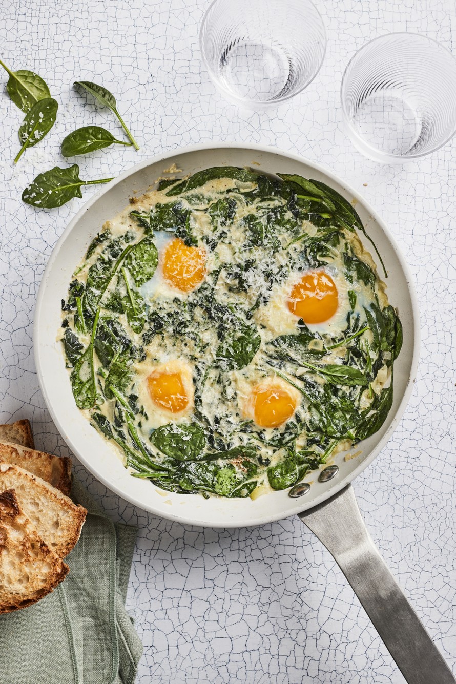 Pinaatin ja kananmunan liitto on taivaassa solmittu! Ihanan helpot, pinaatilla höystetyt pannumunat sopivat niin pieneksi lounaaksi kuin brunssillekin.