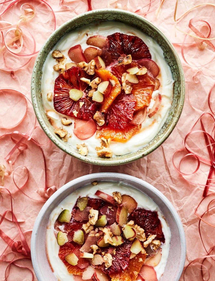 Aamiaiskulhossa raparperi yllättää kypsentämättömänä. Appelsiinimehu ja siirappi pehmentävät sen makua sopivasti.