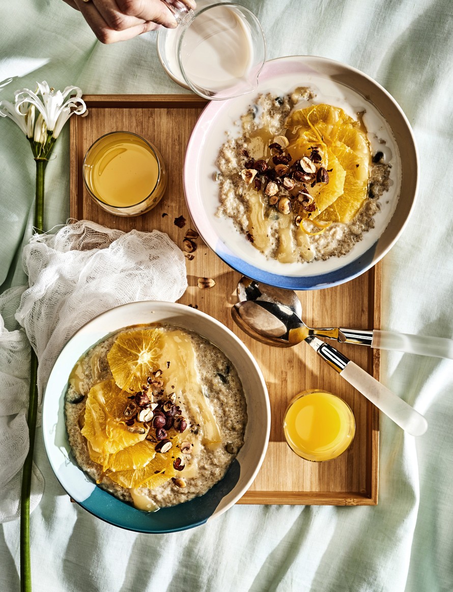 Tarjoa puuro pähkinärouheen, appelsiinien, sitrustahnan ja mantelimaidon kanssa.