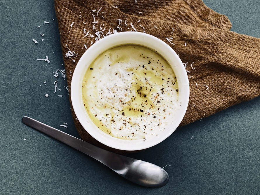 Tässä reseptissä mannapuurosta tehdään suolainen välipala. Makumaailma on kuin Cacio e pepe -pastassa, rakenne puolestaan kuin polentassa. Halutessasi voit lisätä suolaisen puuron päälle esimerkiksi paistettua kesäkurpitsaa, valkosipulia, persiljaa tai chiliä.