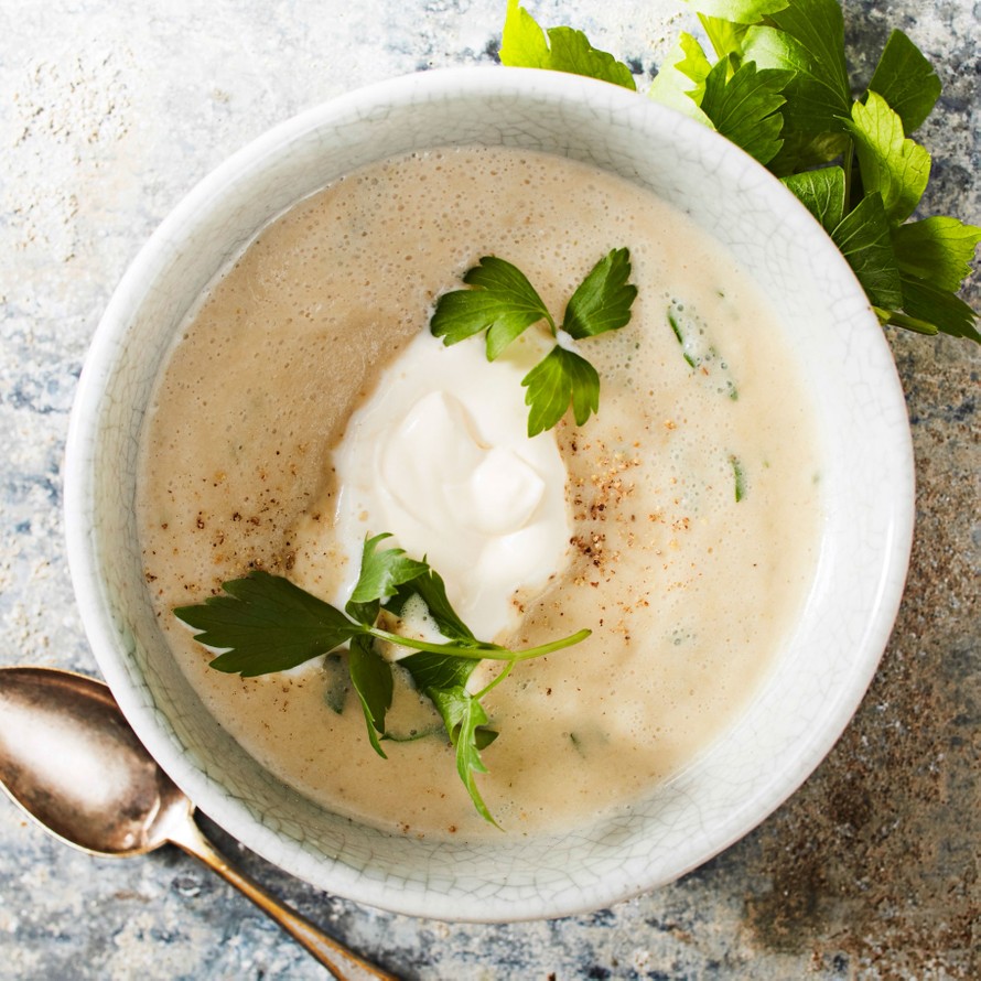 Tätä herkullisempaa alkukeittoa saa hakea! Lempeän kermainen maa-artisokkakeitto saa sopivasti ytyä lipstikasta.
