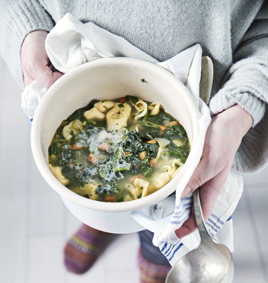 Vinkki! Saat keitosta kasvisversion käyttämällä kasvislientä sekä sieni- tai pinaattitäytteisiä tortellineja.
