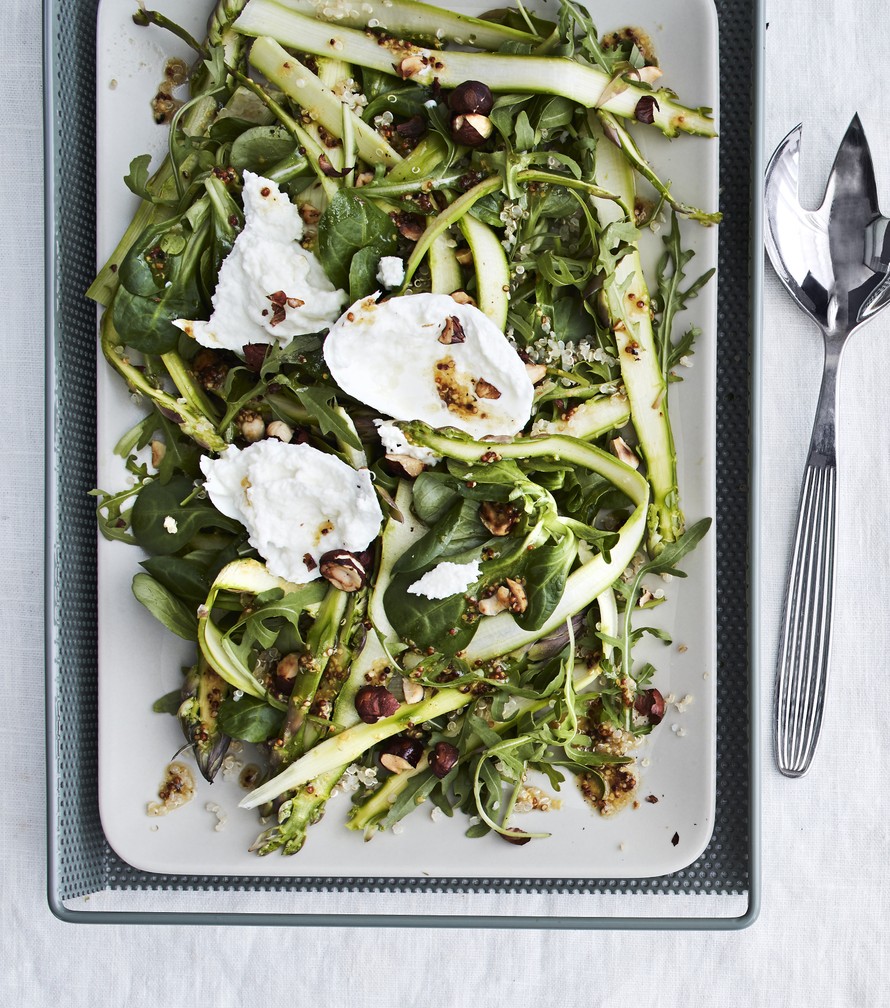 - Katkaise parsoista puumainen tyvi pois. Viipaloi parsat kuorimaveitsellä ohuiksi suikaleiksi. Sekoita parsasuikaleet, kvinoa, pähkinärouhe ja salaattisekoitus vadilla tai salaattikulhossa.
