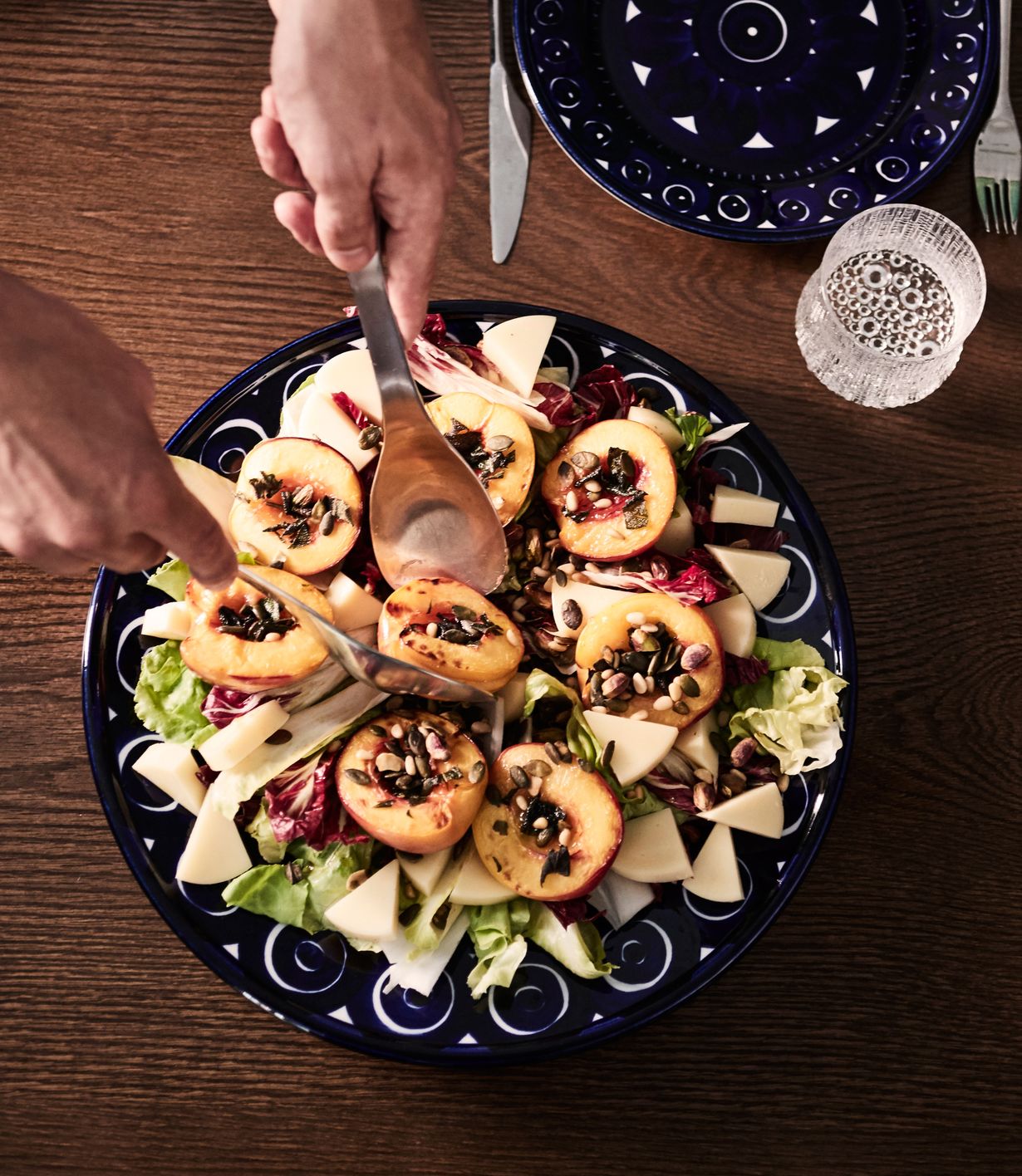 Kapellimestari Hannu Linnun bravuurisalaatissa yhdistyvät maukas juusto ja mehukkaat persikat.
