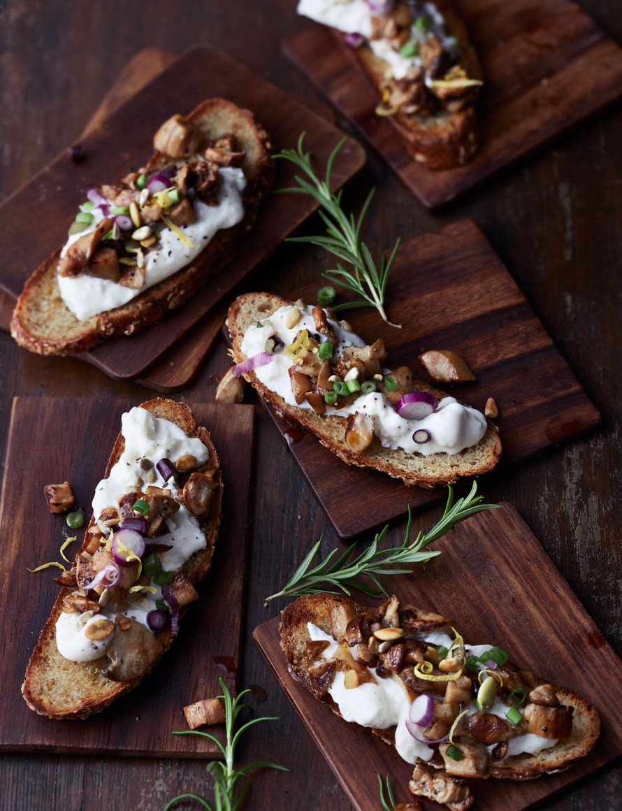 - Lusikoi sieniseosta ja revi burrataa leiville. Viimeistele ne siemenillä ja ruohosipulilla.