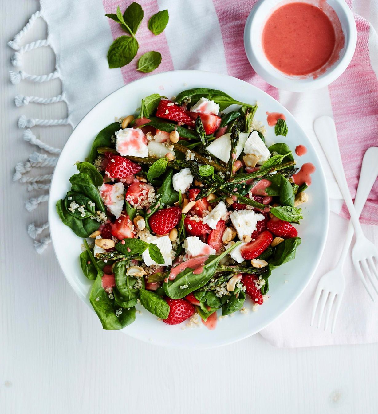 - Pilko mansikat ja leikkaa hunajamelonit kuutioiksi salaattikulhoon. Revi joukkoon kotijuusto sopivan kokoisiksi suupaloiksi. Leikkaa parsat noin 5 cm pätkiksi ja lisää salaattikulhoon yhdessä jäähtyneen kvinoan, paahdettujen cashewpähkinöiden ja pinaatin kanssa.