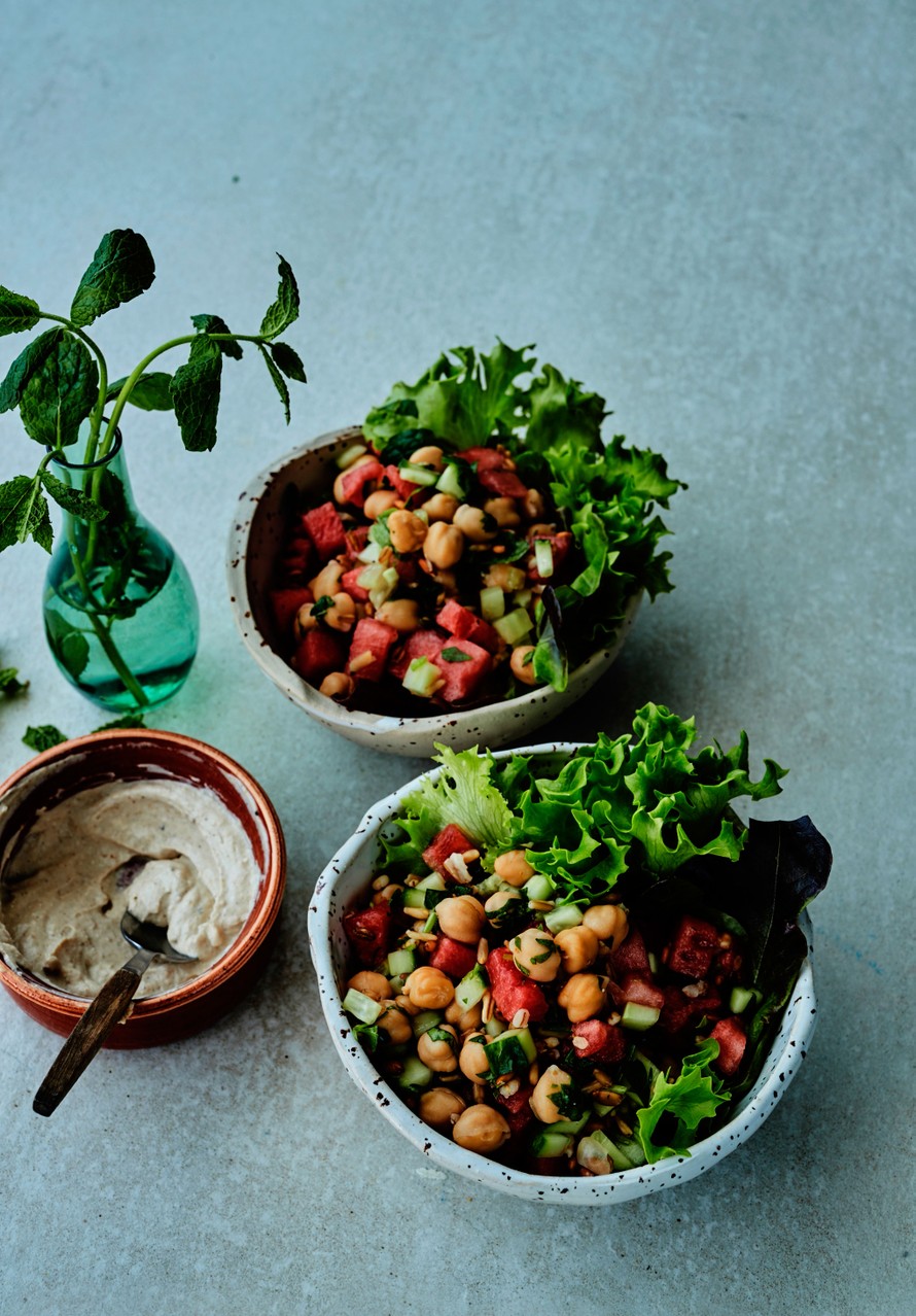 - Hienonna yrtit. Valuta kikherneet liemestä ja huuhtele kylmällä vedellä lävikössä. Huuhtele kurkku ja kuutioi. Kuutioi myös vesimeloni. Huuhtele salaatinlehdet ja taputtele kuivaksi talouspaperilla.