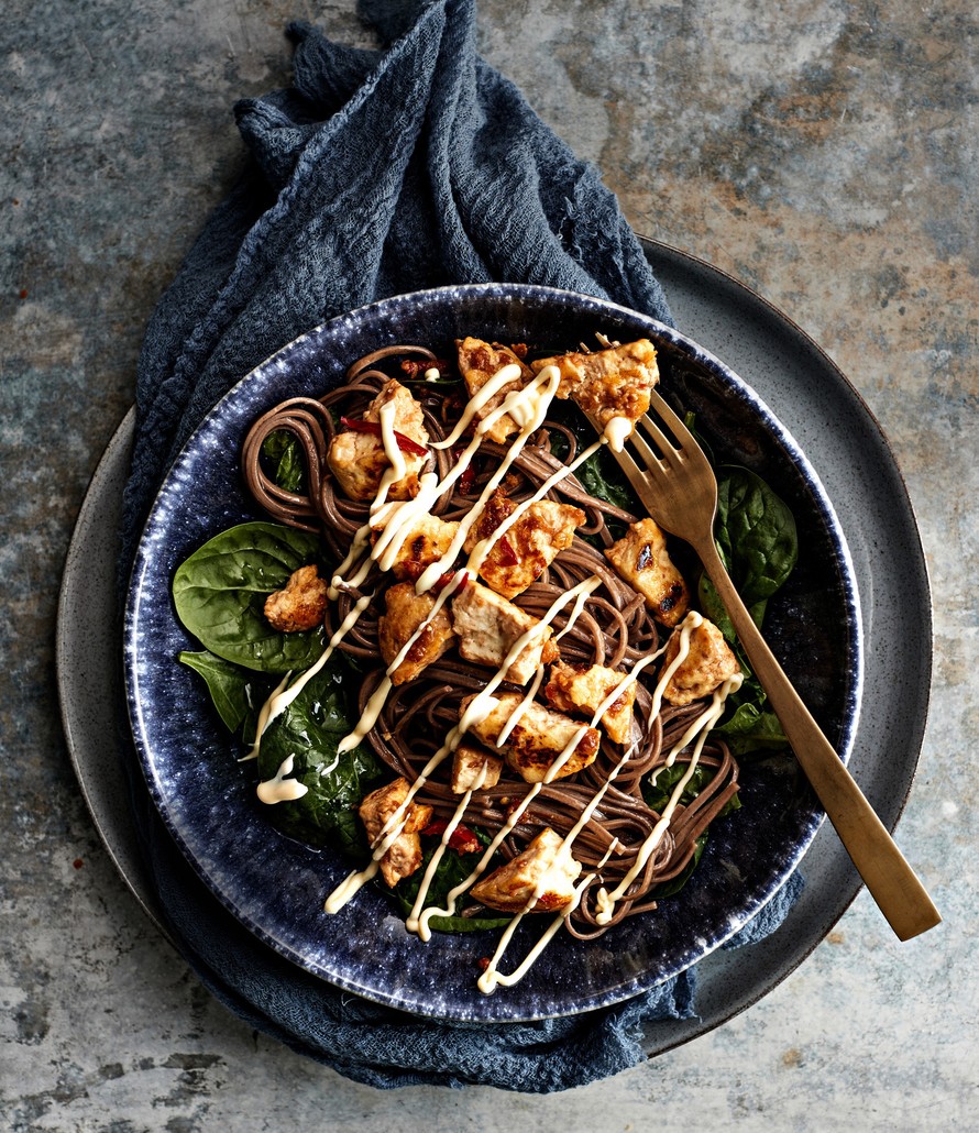 Nyhtömenetelmä ja maustaminen tuovat tavallisen tofun parhaat puolet esiin. Kun annokseen yhdistää japanilaisen majoneesin ja tattariset nuudelit, se on siinä.