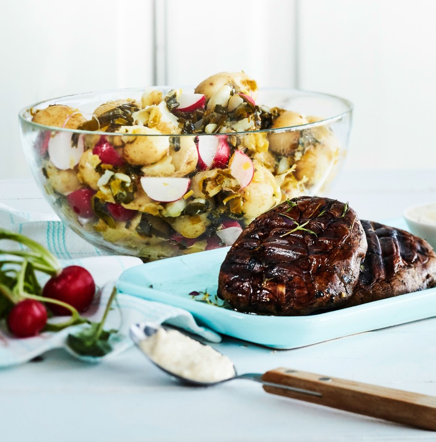 Vaikka grillattuja portobellosieniä voisi verrata pihviin, emme tee sitä. Mehevyys ja maku ovat nimittäin omaa luokkaansa. Tarjoa portobellot kikhernetsatsikin ja karamellisoidulla purjolla höystetyn perunasalaatin kanssa, niin lautaseltasi ei puutu mitään.