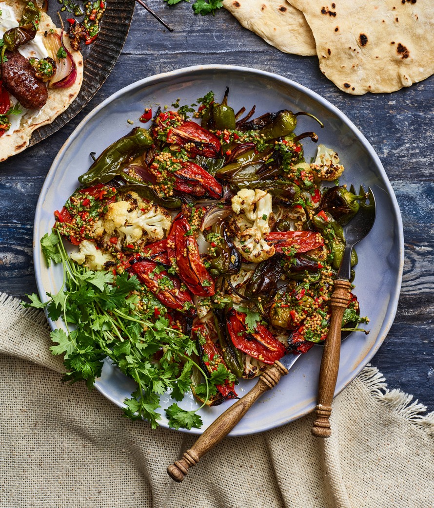 Siirrä kasvikset grillistä vadille tai kulhoon ja kääntele marinadi joukkoon. Revi loppu korianteri päälle.
