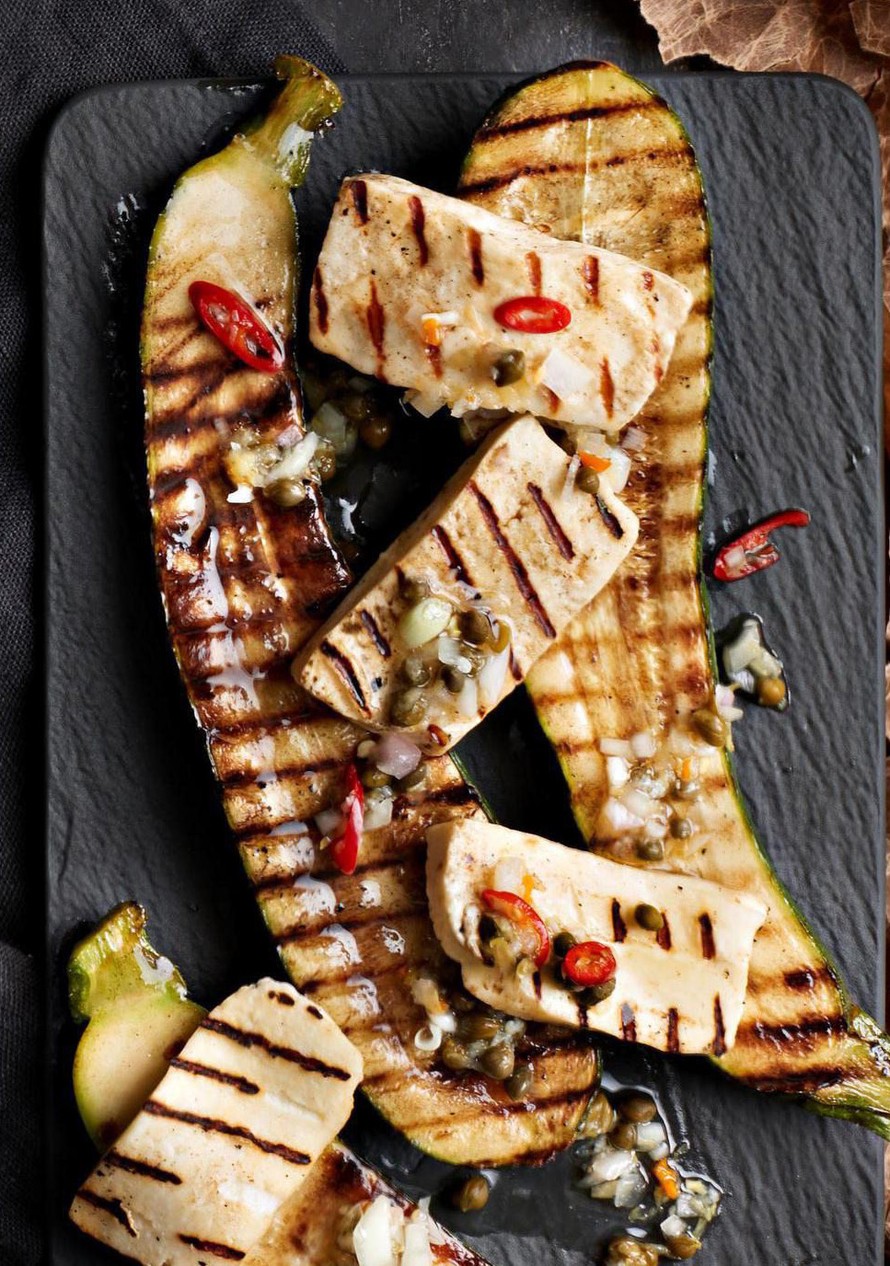 Siirrä kesäkurpitsa ja halloumi tarjoiluvadille ja ripottele osa kapriskastikkeesta päälle. Tarjoa loput erikseen.