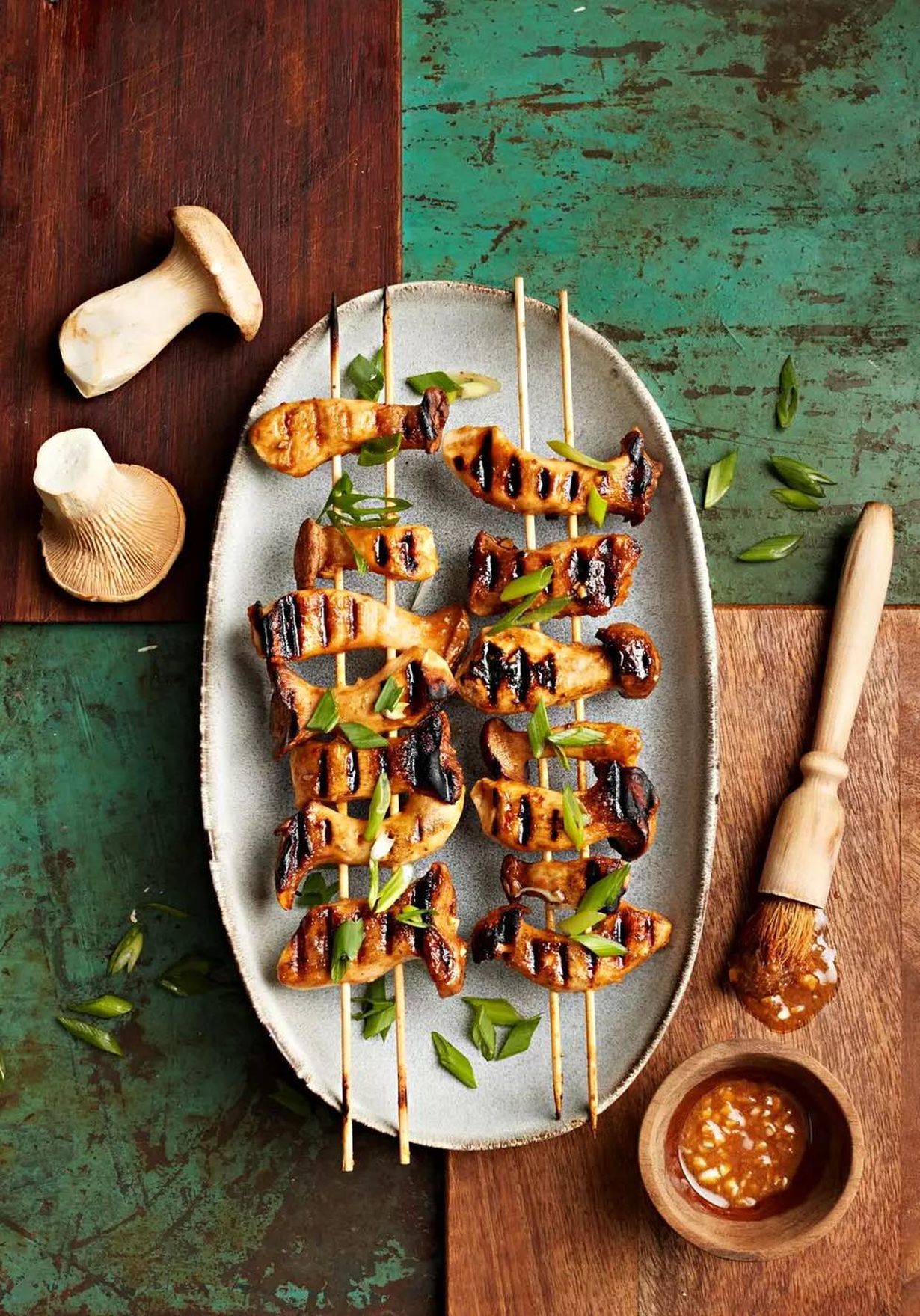 - Pujottele sienet vartaisiin ja valele marinadilla. Grillaa sienet molemmin puolin kauniin värisiksi, noin 5 minuuttia per puoli. Viimeistele silputulla kevätsipulilla.