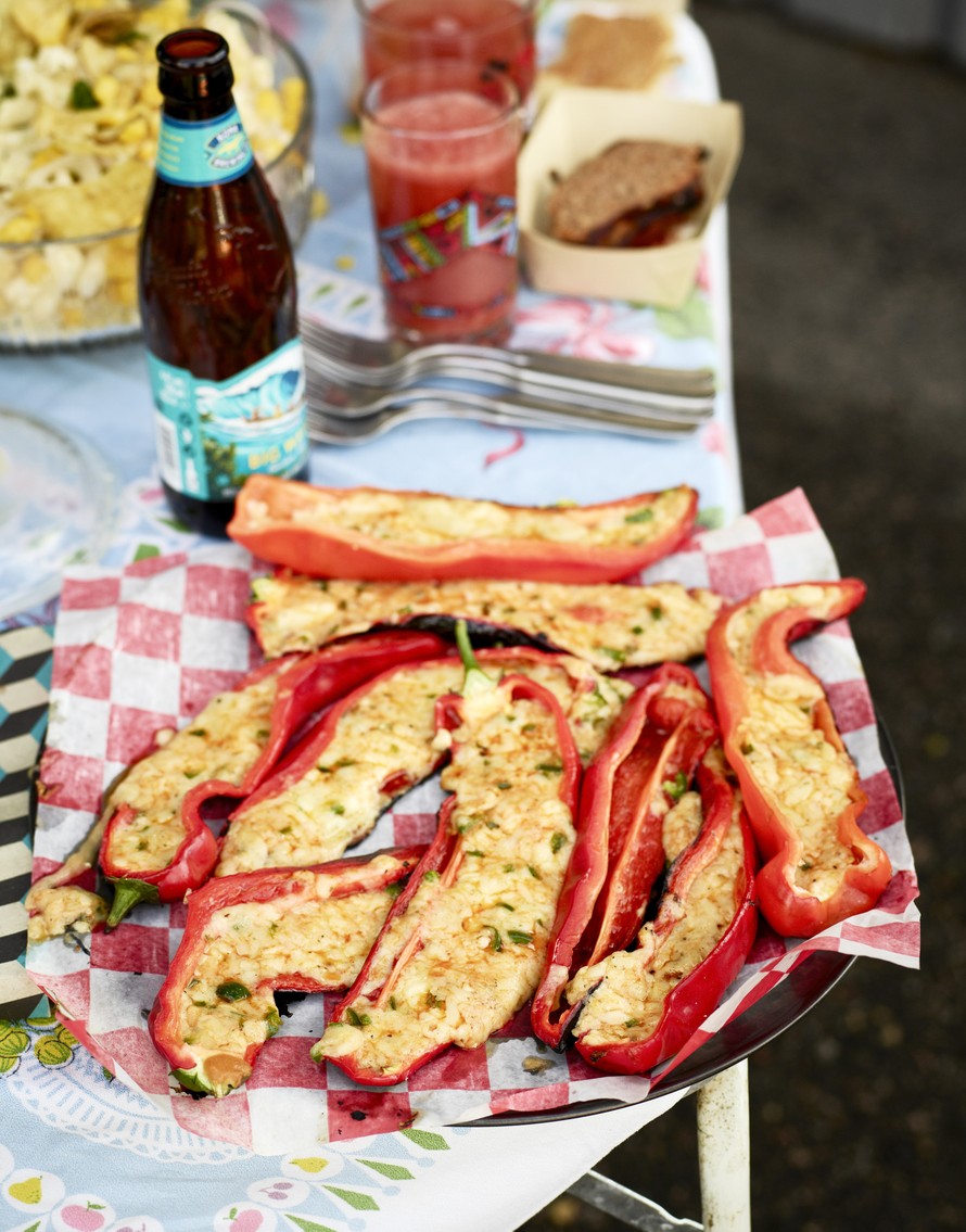 - Kuumenna grilli. Painele juustotahna paprikanpuolikkaisiin ja asettele ne kuoripuoli alaspäin grilliin, hieman sivuun hiillokselta. Paahda noin 5 minuuttia, kunnes juusto sulaa ja alkaa kuplia. Nosta paprikat lastalla varovasti tarjoiluvadille.