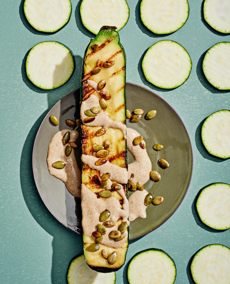 Grillattu kesäkurpitsa saa ihanan uuden maun, kun sen sivelee seesamiöljyllä ja viimeistelee sitruunaisella tahinikastikkeella.