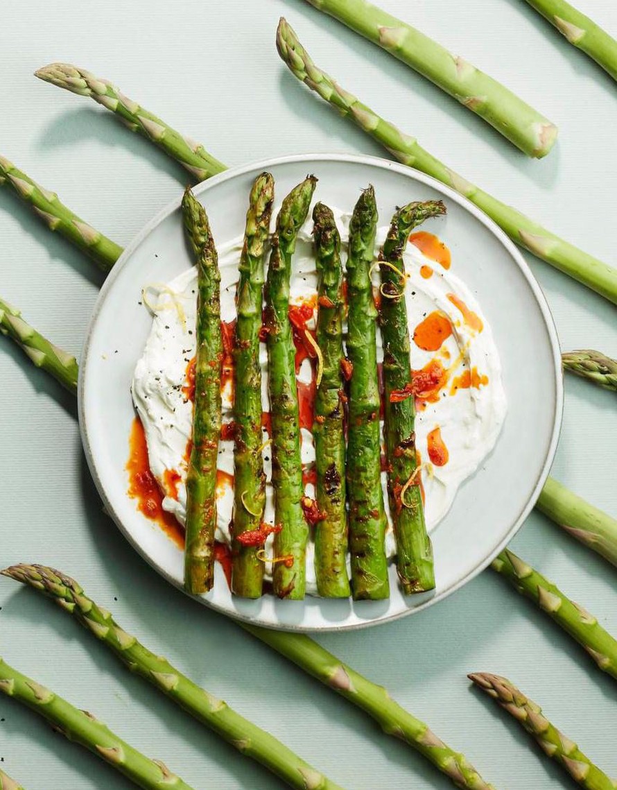Levitä labneh lautasille, nosta parsat päälle ja valuta pinnalle chiliöljyä.