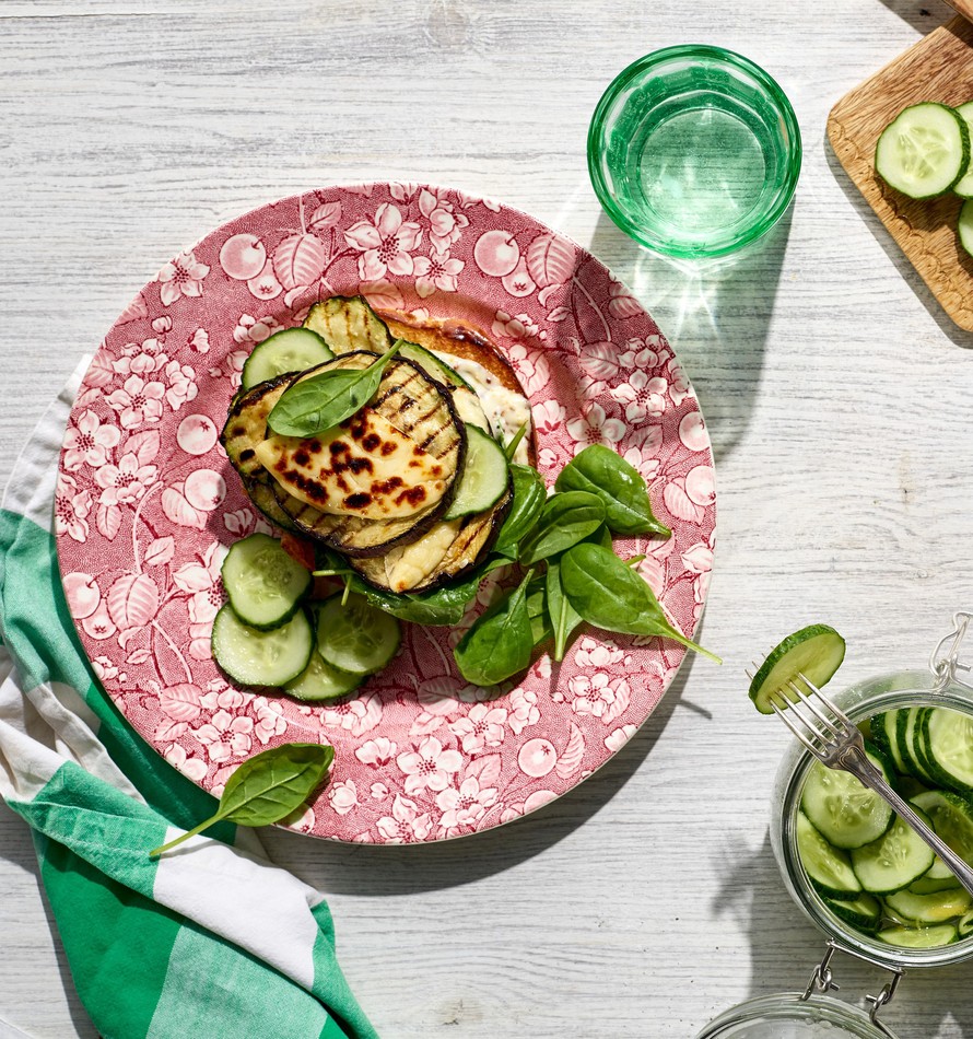 Lusikoi majoneesi leiville ja lado hölskykurkkuja, kesäkurpitsaa, pinaattia ja leipäjuustolla gratinoituja munakoisokiekkoja päälle.