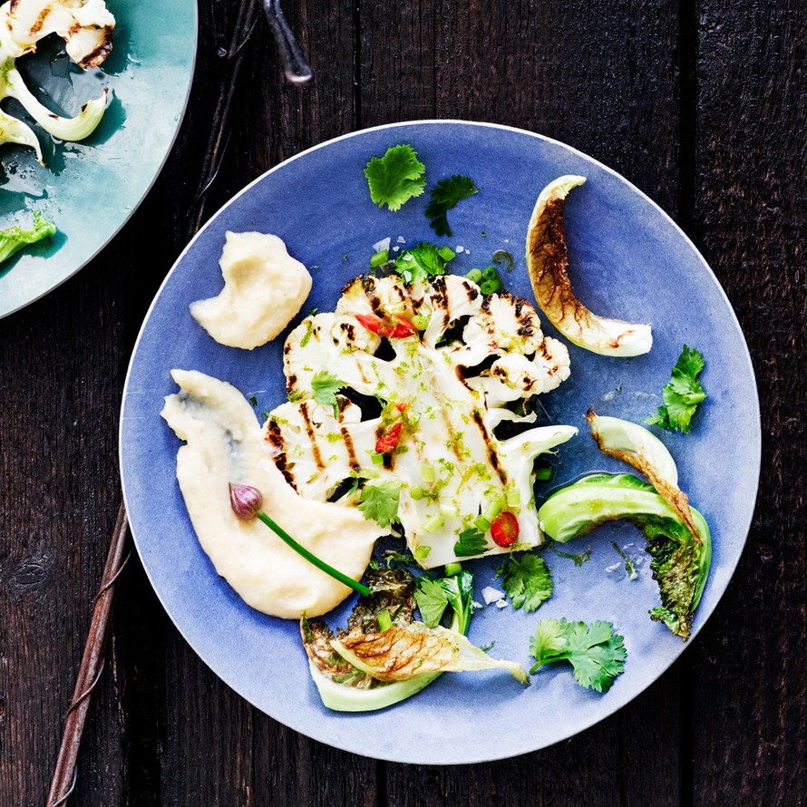 Grillatut kukkakaalipihvit ja cheddarkastiketta.
