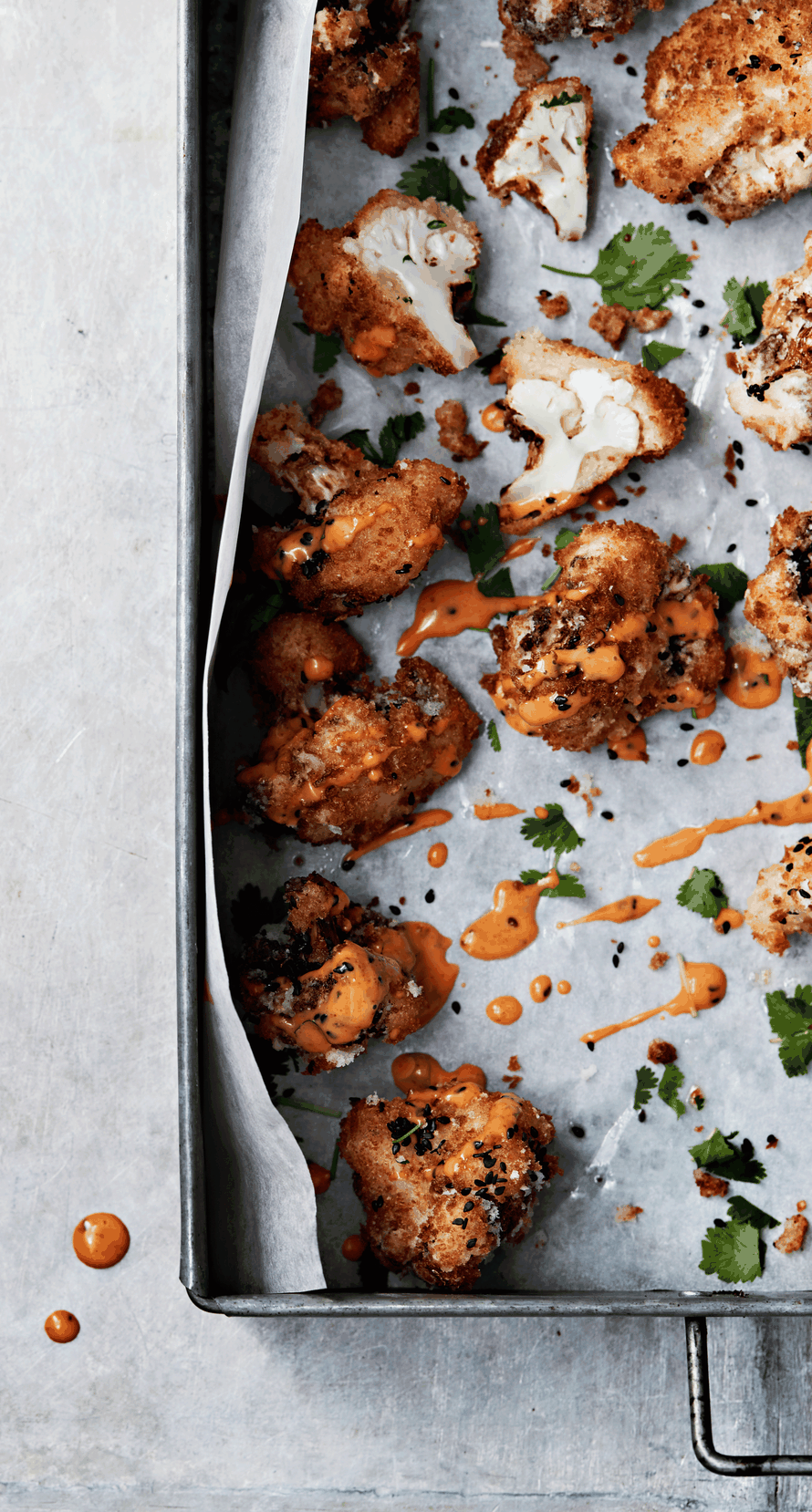 Huolimatta friteerauksesta lopputulos ei ole tunkkainen rasvainen, vaan päinvastoin: rapea ja koukuttava. Kukkakaalit tarjotaan makean tulisen bang bang -kastikkeen kanssa, joka on Muusan versiossa vegaaninen. Sama ohje sopii hyvin myös parsakaalifritterien valmistukseen.