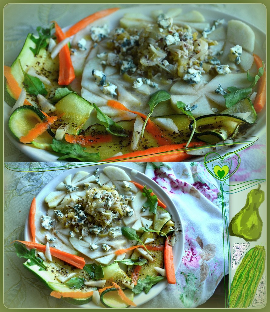 Kuori ja paloittele selleri. Kuori toinen sipuli ja hienonna. Kuumenna kattilassa kasvisliemi jossa kasvisliemikuutiot, ja laita sellerit ja hienontamasi sipuli sinne keittymään. Lisää kerma, laakerinlehdet, viini ja kuumenna noin 20 minuuttia. Siivilöi neste kulhoon ja poimi laakerinlehdet pois. Kuori toinen sipuli myös ja valkosipulinkynnet ja hienonna. Paista ne kannen alla voissa kattilassa riisin kanssa lisäten myös kasvisliemi sellerillä ja sipulilla joukkoon ja sekoita joukkoon hasselpähkinät. Keitä miedolla lämmöllä 15-20 minuuttia. Tee tällä välin rapeat kesäkurpitsanauhat; puhdista kesäkurpitsat vedessä ja leikkaa ne ohuiksi liuskemaisiksi nauhoiksi juustohöylällä. Höyrytä ne toisessa kattilassa ritilän päällä niin että vettä ulottuu ritilän pohjaan asti. Höyrytä kunnes ne ovat hieman pehmenneet. Laita öljy wok-pannuun ja paista kesäkurpitsanauhat vielä rapeiksi ja siihen sivuun voit kuullottaa kevätsipulia ja porkkanasiivuja. Vatkaa niihin kaadettava liemi kulhossa; sekoita öljy, omenaviinietikka, basilikamauste, korianterimauste ja paprikajauhe keskenään. Samalla kuori päärynät ja siivuta ne pituussuunnassa tehden niihin koristeellisia leikkauksia sivuille. Tarjoa selleri-homejuustorisotto aura sinihomejuustolla ja päärynäsiivuilla, sekä koristele annoslautasiin rapeat kesäkurpitsanauhat ja niiden päälle liemi, ja porkkanan ja kevätsipulin siivuja.