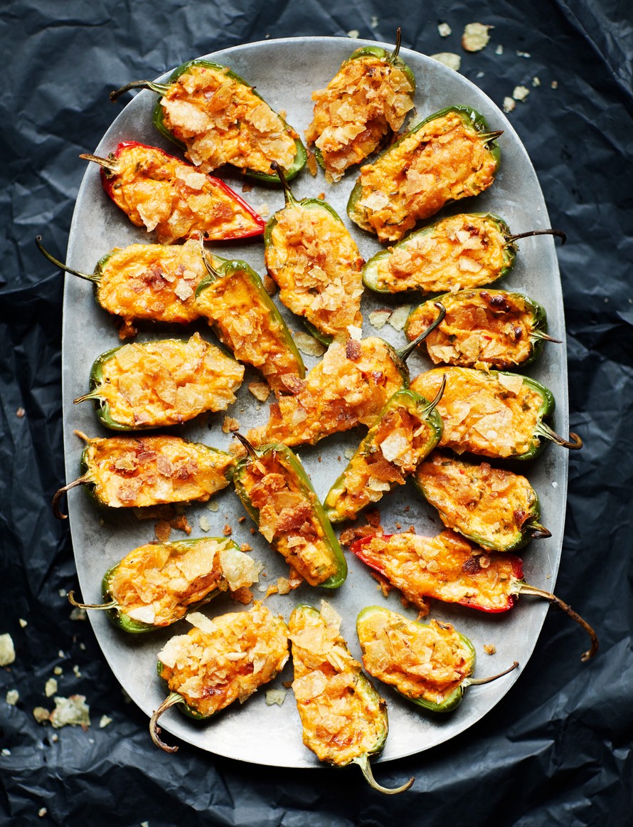 Täytetyt jalapenot ovat täydellistä naposteluruokaa oluen kera vaikka saunailtaan. Suolaiset murennetut perunalastut tuovat ihanaa rapeutta suupaloihin.