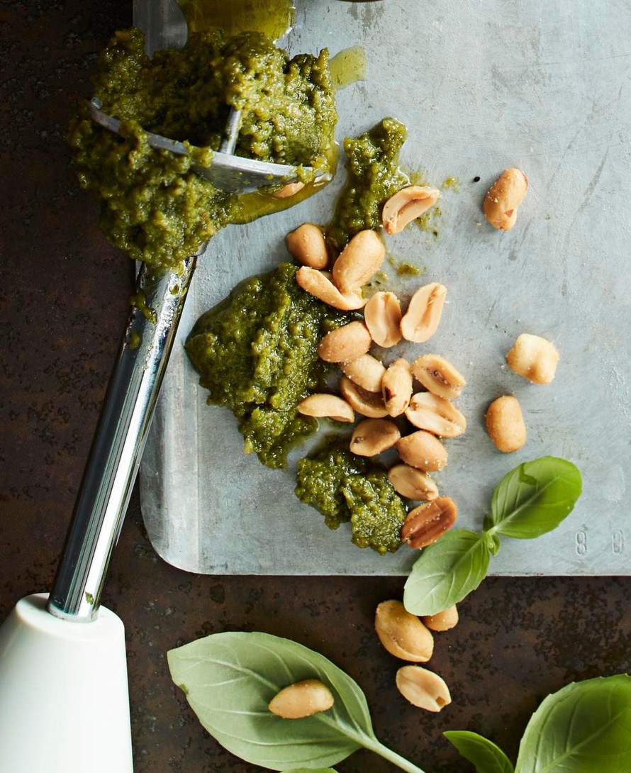 Löytyykö kaapistasi suolapähkinöitä? Käytä ne pestoon! Voit säädellä peston makua ja juoksevuutta sillä, mitä ja kuinka paljon öljyä käytät. Suolan lisäämisen saat unohtaa.