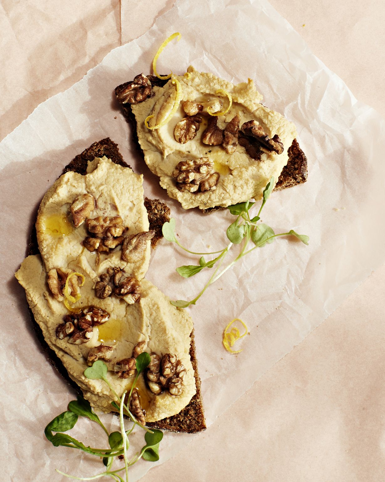 - Laita ruisleivät leivinpaperin päälle pellille. Leikkaa kumpikin kahteen osaan eli saat yhteensä neljä leipäpalaa. Levitä niiden päälle valkopapuhummus aaltoilevaksi, paksuksi kerrokseksi. Ripottele pinnalle kevyesti rouhittuja saksanpähkinöitä.