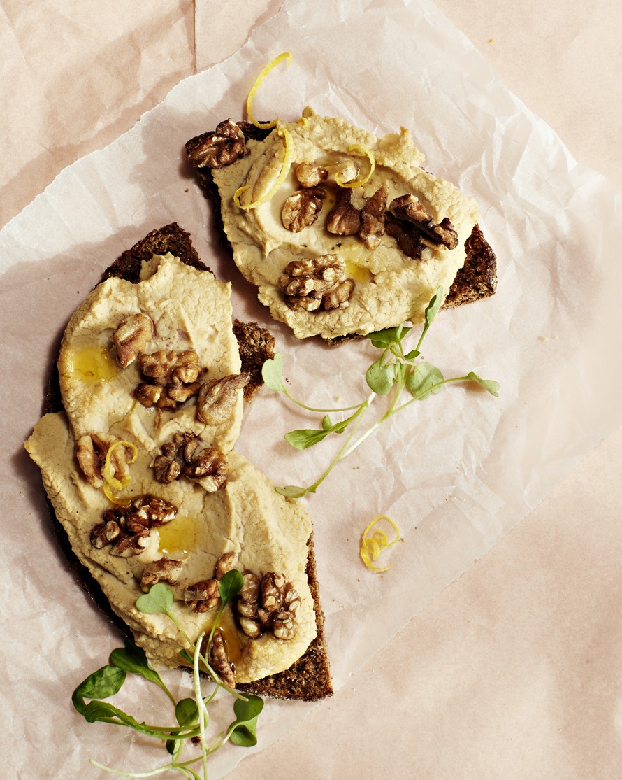 Lämppärit uudella tavalla! Trendikäs kuuma hummus ja paahtuneet saksanpähkinät tekevät leivistä herkullisia.