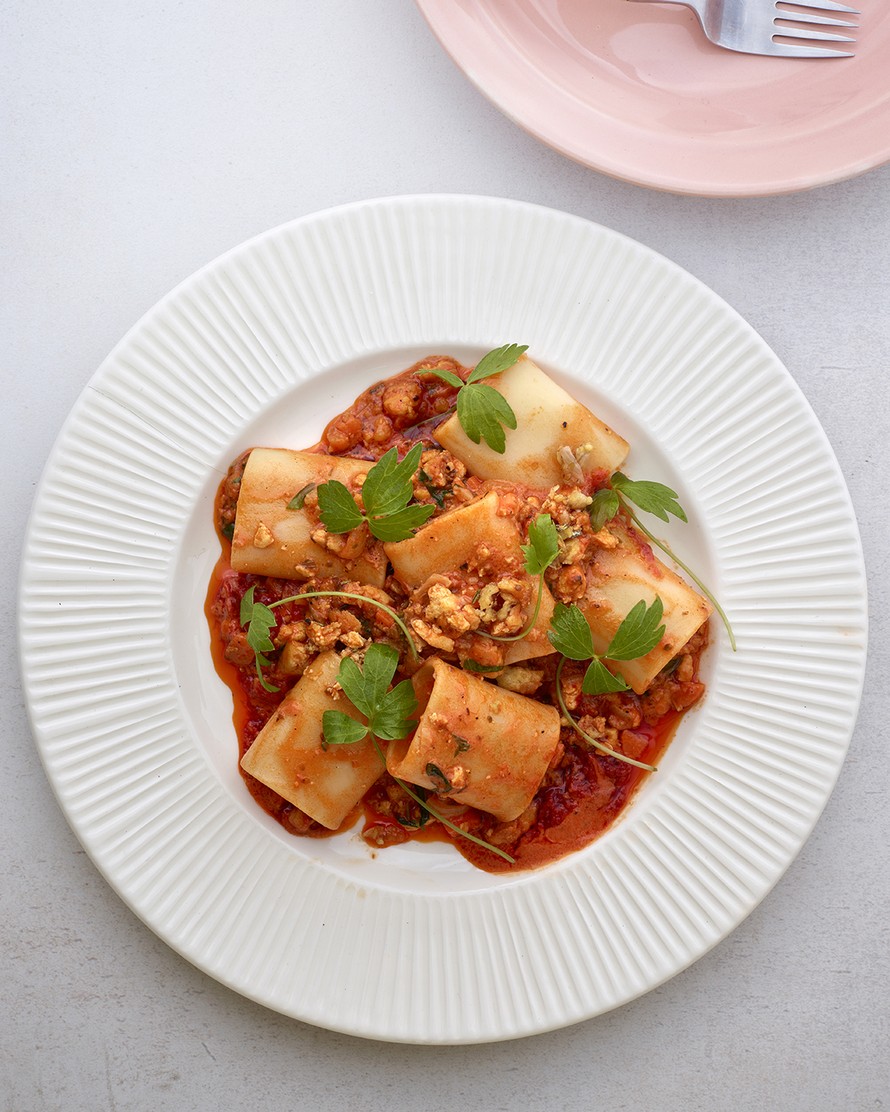 Bolognesen tyylinen kastike onnistuu tofustakin! Tarjoa se tagliatellen kanssa tai keitä seuraksi trendikästä jättimakaronia, paccheria.